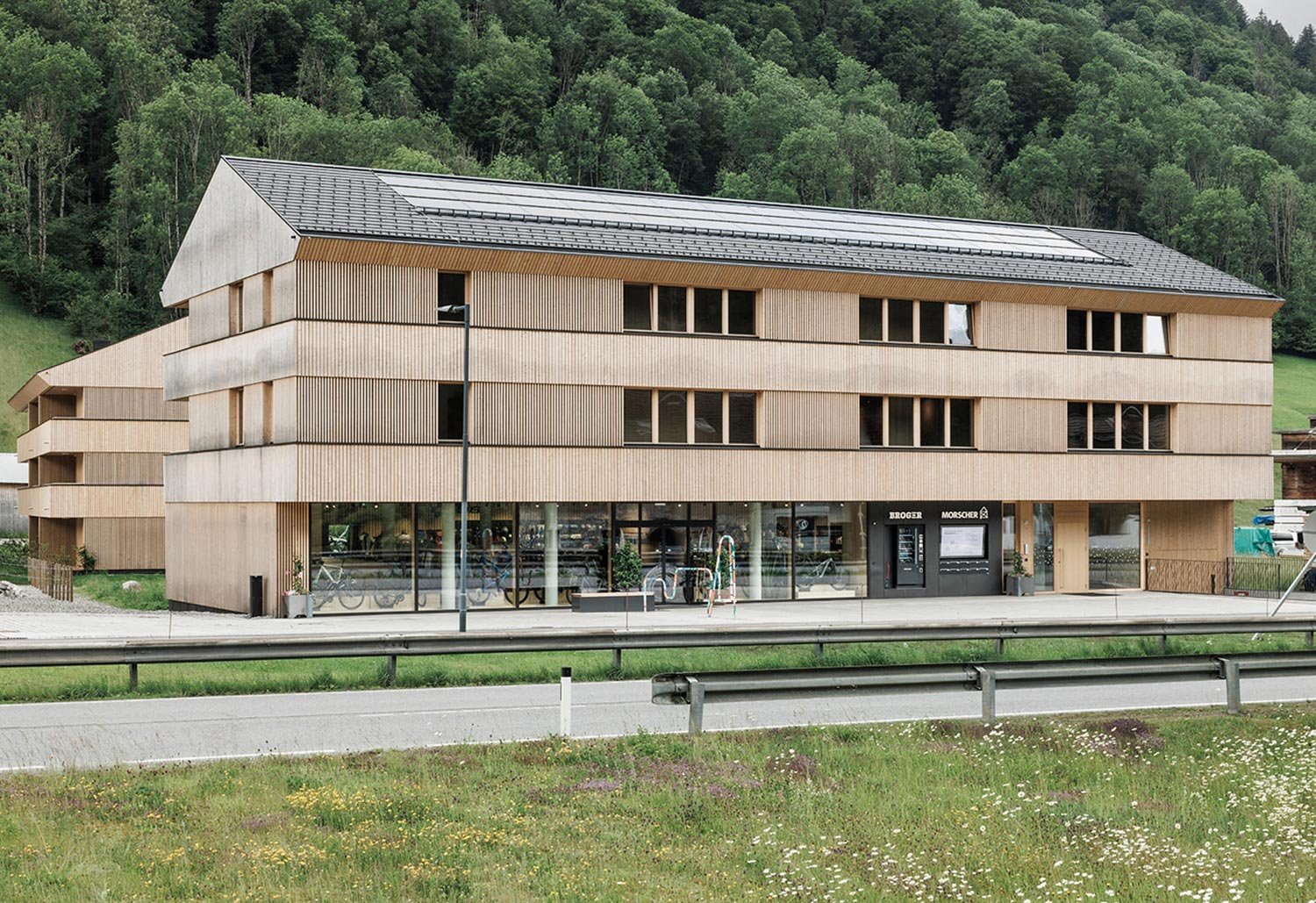 Ein nachhaltiges Bauensemble in Mellau vereint Wohnen, Arbeiten und Gewerbe zu flexiblen Räumen im landschaftlichen Kontext des Bregenzerwaldes.