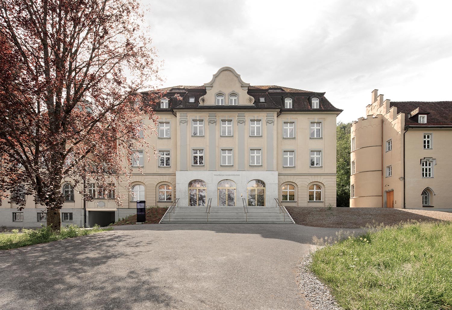 Mit minimalen Eingriffen wurde die Vorarlberger Landesbibliothek zur Stadt geöffnet und als zugänglicher Bildungsort mit Bezug zu Landschaft und Geschichte neu gestaltet.