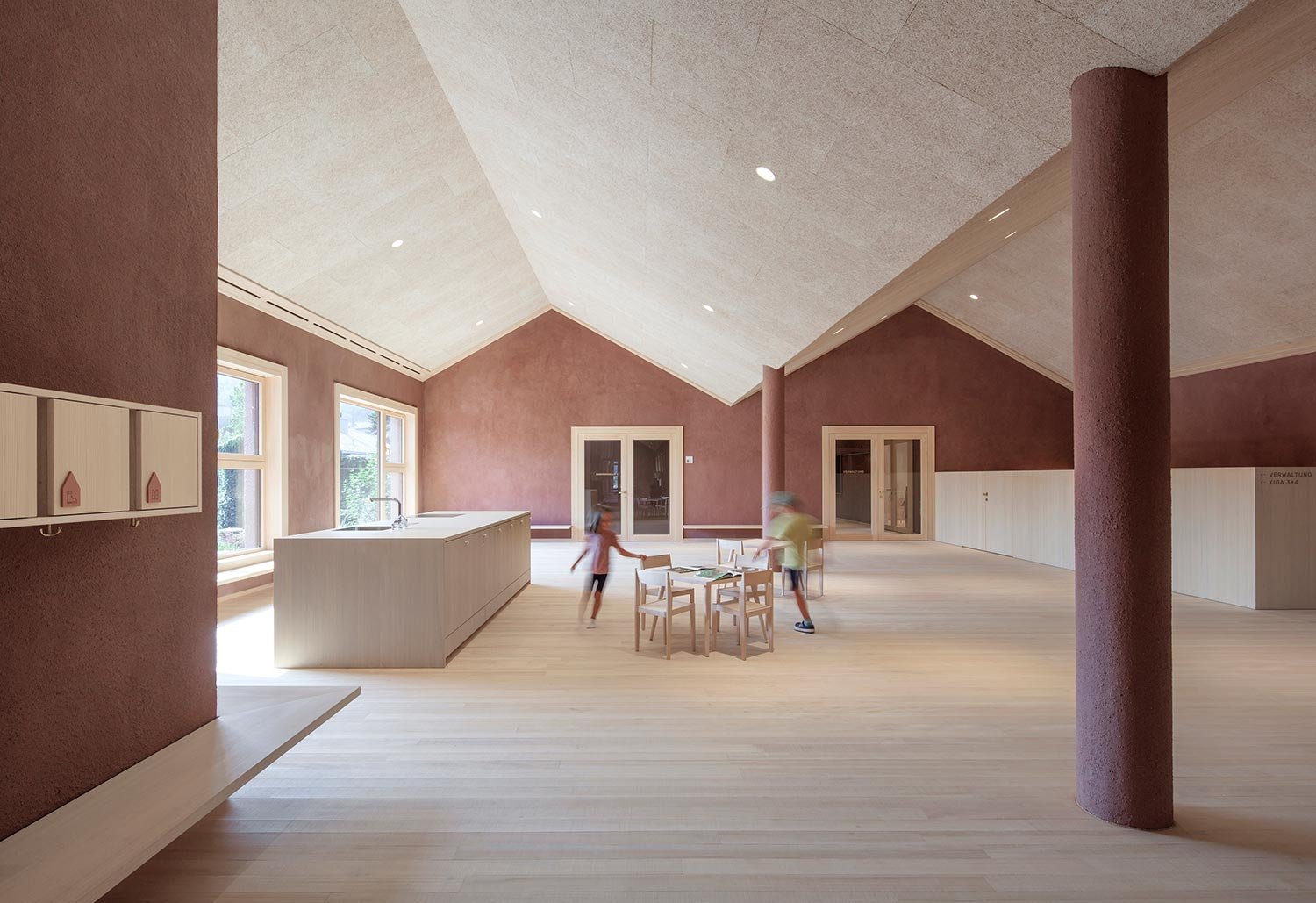 Die pädagogischen und gemeinschaftlichen Ziele wurden innen wie außen vorbildhaft umgesetzt. Ein zentraler Marktplatz als kommunikativer Begegnungsort für Kinder, Eltern und Pädagog:innen ermöglicht die gewünschte altersübergreifende Durchmischung der Kinder. In den anbindenden Gebäudeflügeln wurden geschützte Bereiche für die Lerncluster geschaffen. Die Spiel- und Freiflächen lassen sich über die Innenhöfe erschließen. Das vielseitige Freiraumkonzept geht gezielt auf die unterschiedlichen Bedürfnisse der drei Nutzer:innengruppen ein und bietet individuelle Rückzugsräume und Entfaltungsmöglichkeiten. Die naturnah gestalteten Außenanlagen fördern darüber hinaus die Artenvielfalt, unterstützen die Wasserrückhaltung und leisten einen positiven Beitrag zum Umgang mit den klimatischen Veränderungen.