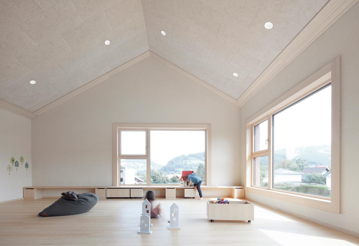 Mit der Erweiterung zum Bildungszentrum istein gemeinsamer Ort für Kinderbetreuung, Kindergarten und Volksschule entstanden. Die vier Flügel des Grundrisses verweben sich behutsam mit den angrenzenden Freiräumen. Die architektonische Ausformulierung kaschiert dabei geschickt das für die drei Einrichtungen notwendige, große Bauvolumen. Auch die kurzen Giebelfronten fügen sich in ihrer Dimension harmonisch in die gewachsene Struktur und Körnung des dörflichen Ortskerns ein.