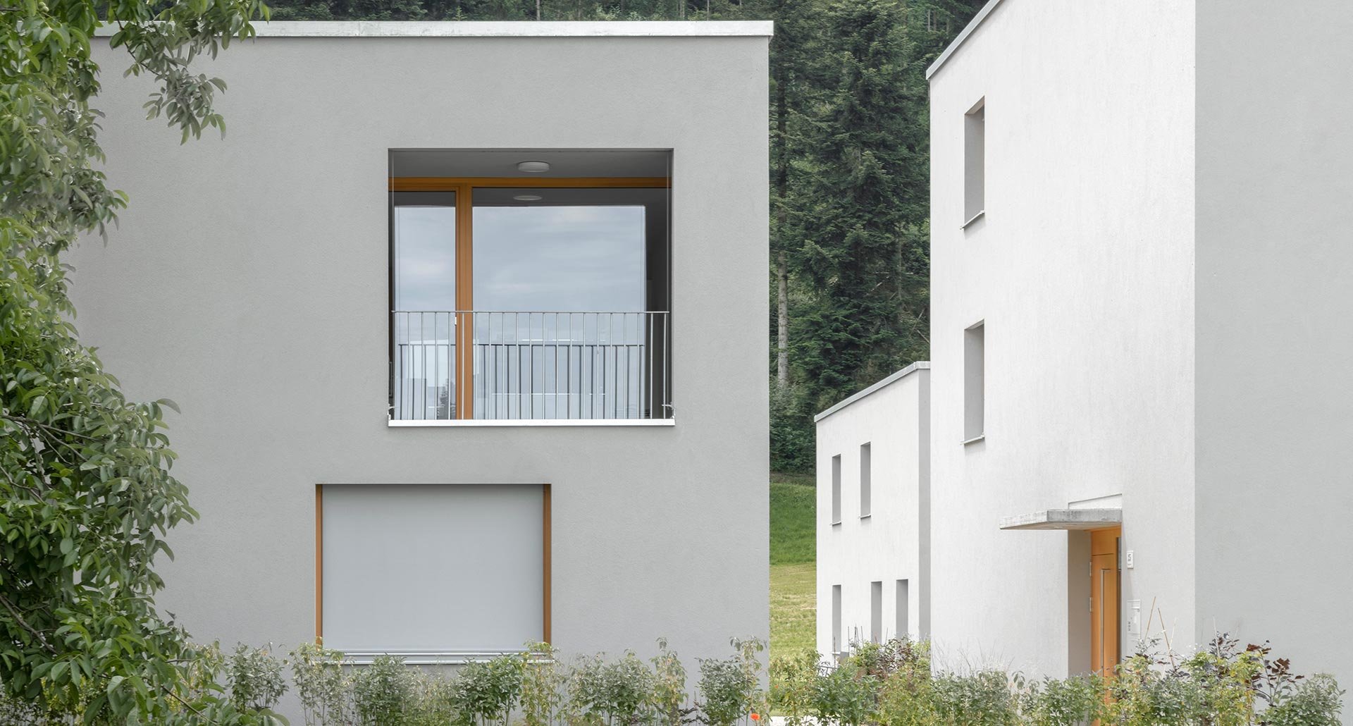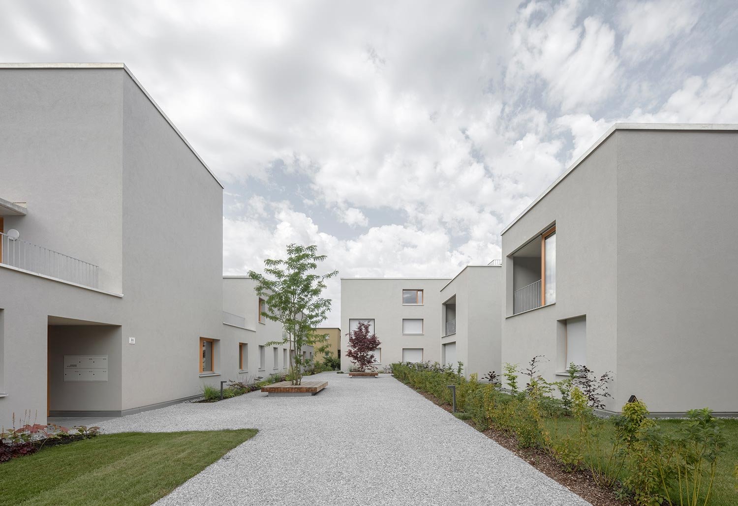 Auf dem ca. 4.000 m2 großen Grundstück verteilen sich 34 Einheiten auf vier stark gegliederte Baukörper, die mit ihren Vor- und Rücksprüngen viel Privatheit ermöglichen, während der zentrale Hof zur ungezwungenen Gemeinschaft einlädt. Dabei spielt die Freiraumplanung eine tragende Rolle. Sie überzeugt mit einem differenzierten, aber nicht zu kleinteiligen Bepflanzungskonzept, Holzpodeste offerieren sich für beiläufige Treffen und farbenfrohe Hecken bilden keine Barrieren, sondern Brüstungen für einen nachbarschaftlichen Plausch. Auf der Außenseite öffnen sich Privatgärten zum angrenzenden Grüngürtel. Andere Wohneinheiten verfügen über großzügige Dachterrassen und Loggien. Die mehrseitige Orientierung der Wohnungen hebt ihre Qualität weit über jene der in Vorarlberg bekannten „Blöckle“ hinaus und erinnert eher an die Atmosphäre eines Einfamilienhauses. Der zentrale Quartiershof, bei dem die Bauherrschaft Mut zu einer großen wassergebundenen Oberfläche zeigte, bildet ein robustes Rückgrat für eine effektive Erschließung der Wohnungen. Dadurch konnten Verkehrsflächen und Kosten reduziert werden, ein Beitrag zur Erschwinglichkeit des hochwertigen Massivbaus mit Außenwänden aus doppelschaligem Mauerwerk.