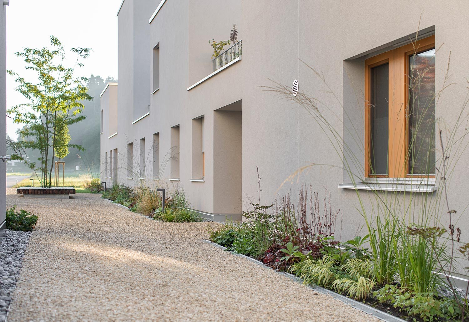 Am Rande von Feldkirch-Nofels zeigt dieses Wohnprojekt, wie gemeinschaftliches Wohnen und individuelle Lebensqualität harmonisch vereint werden können. Wo sonst Einfamilienhäuser dominieren, entsteht eine maßvoll verdichtete Wohnanlage, die Privatheit und Nachbarschaft geschickt in Balance bringt. Vier klar gegliederte Baukörper gruppieren sich um einen offenen Quartiershof, der als sozialer Mittelpunkt und Herz des Ensembles fungiert. Durchdachte Freiraumgestaltung, natürliche Materialien und eine architektonische Körnung, die an den Maßstab des Einfamilienhauses erinnert, verleihen dem Projekt eine unverwechselbare Atmosphäre. Ein überzeugendes Beispiel dafür, wie ländlicher Wohnbau zeitgemäß interpretiert und gemeinschaftlich gedacht werden kann.